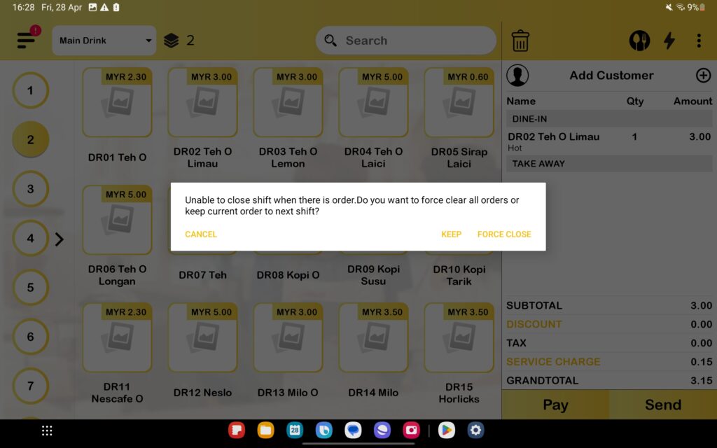 5. When you have orders not yet done, the system will show “Unable to close shift when there is order. Do you want to force clear all orders or keep current order to next shift?” You can press “Cancel” to finish your order or press “Force Close” to close the shift.