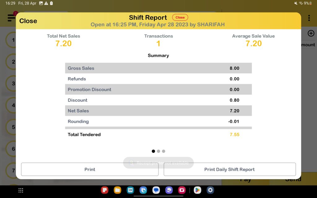 6. After closing the shift, the system will show out shift report and automatically print out the shift report when you connected to your printer.