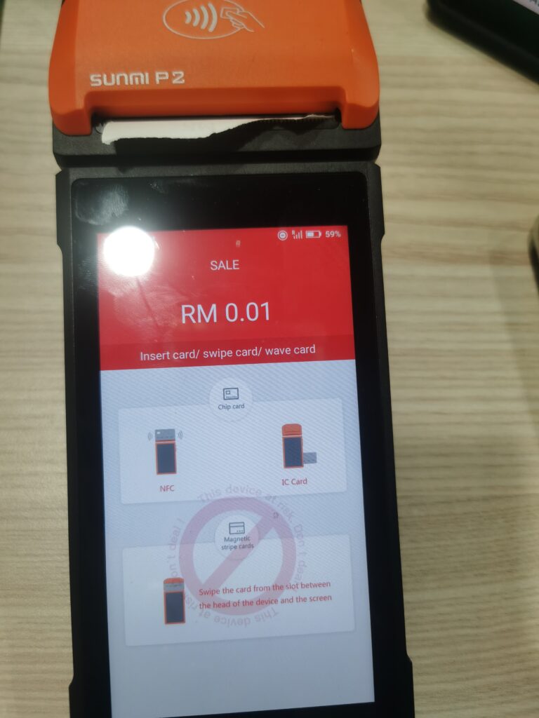 While the Revenue Monster Terminal will automatically change to Insert card/Swipe card/Wave card page. You can perform card transaction in 3 ways which is Insert card, Swipe card, or Wave card.