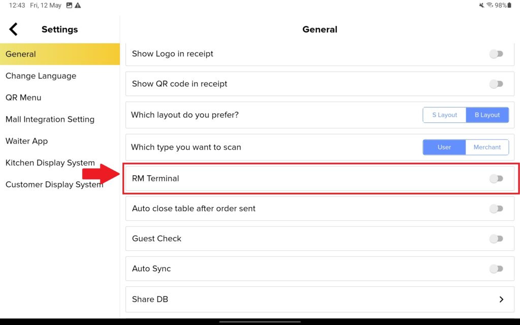 1. First, you need to open BIGPOS Pro or Lite and go to “Settings” and toggle on “RM Terminal“.