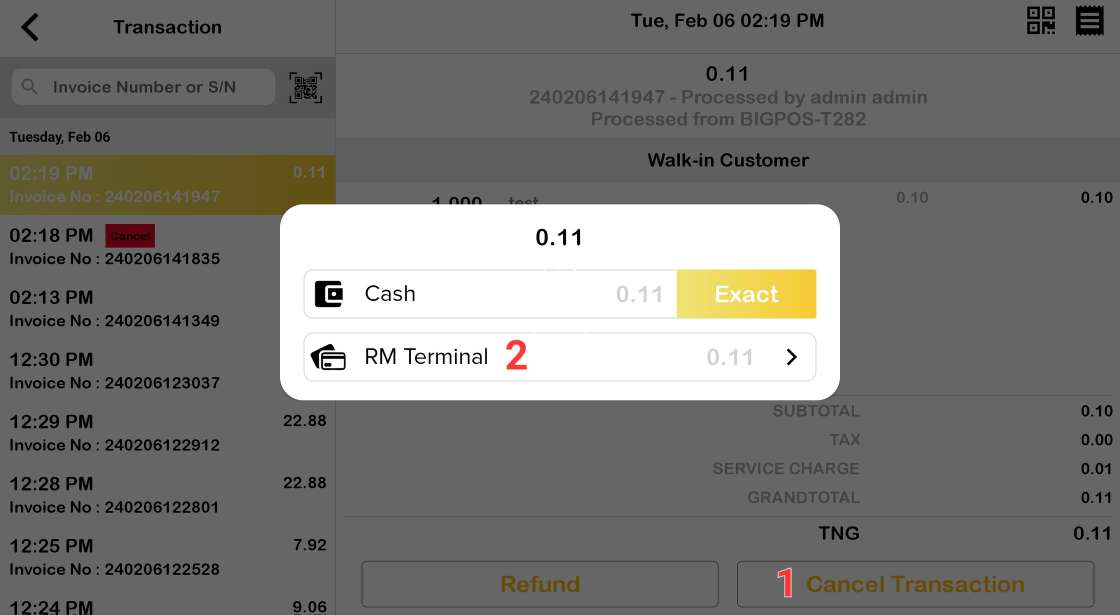 RM terminal only allow full refund. If customer want to perform full refund from Bigpos apps, please use ‘Cancel’ button to refund the transaction. For your information, RM terminal allow cancel and will refund money to both ‘Ewallet’ and ‘Card’ depends on customer payment method.