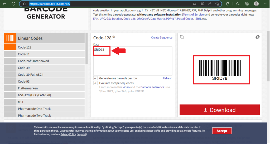 2. Now, you need to generate a barcode image for each product. Barcode can be free generate using this link: Free Online Barcode Generator: Create Barcodes for Free! (tec-it.com)