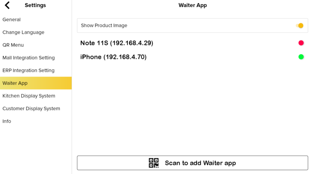 4. Directly click “Waiter App” and tap “Scan to add Waiter app“. The QR code will appear, and waiters can scan it using BIG Waiter.