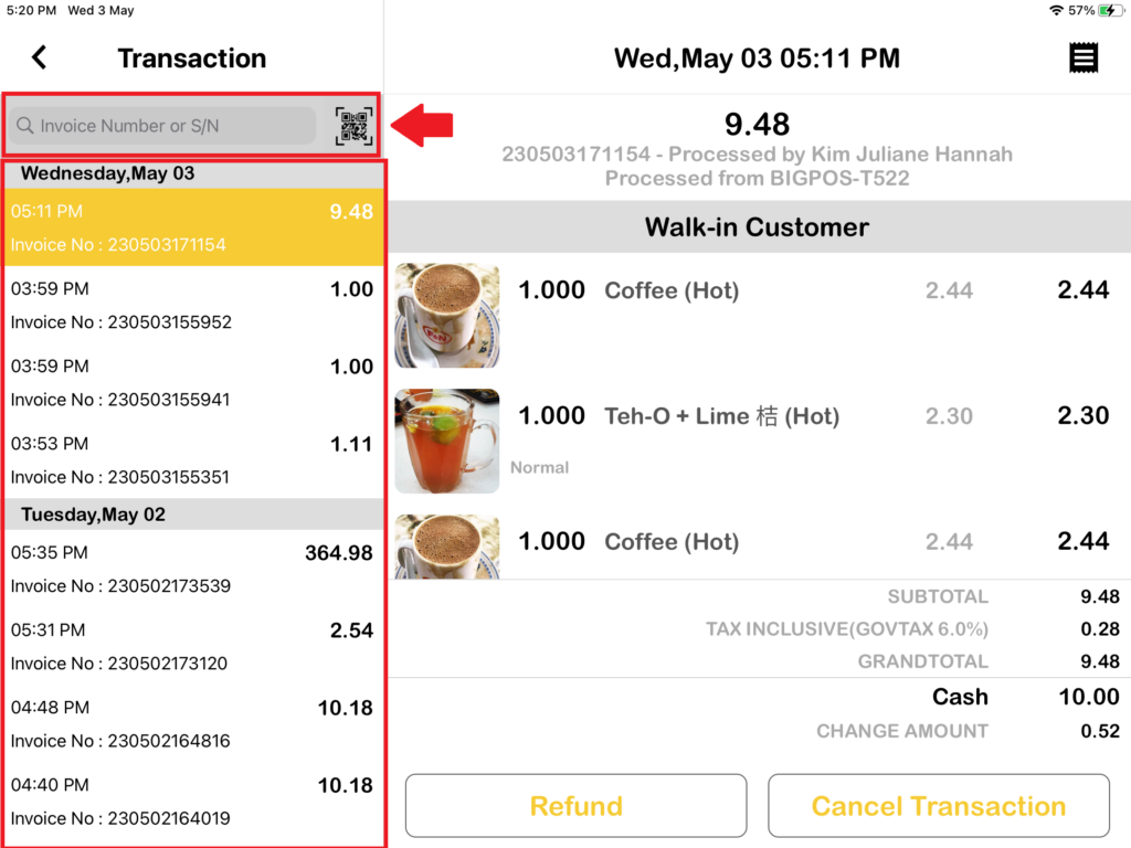 3. Then you can view the past 7 days’ transactions here or longer by scrolling down on the left side. You also can enter the invoice number or scan the invoice QR to find the transaction too.