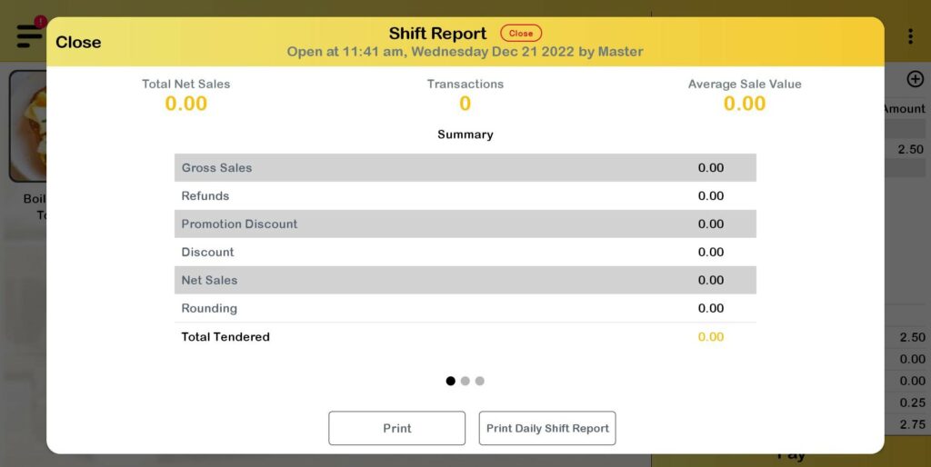 4. The Shift Report will be displayed. The product that has been added to cart will not be calculated in this shift report.