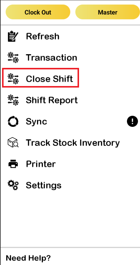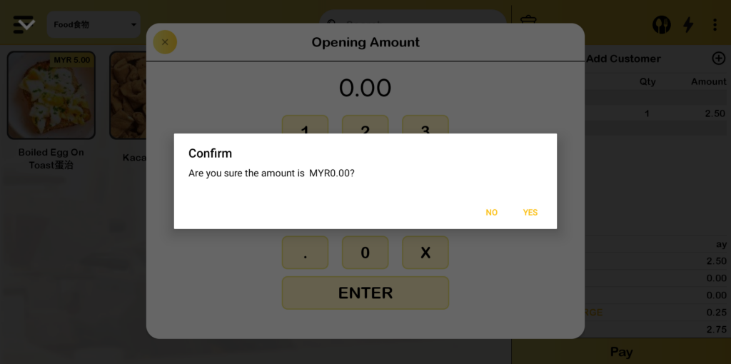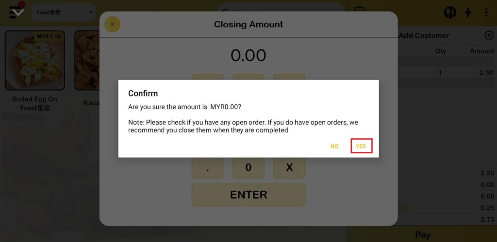 3. Enter the closing amount to proceed with closing the shift and click “YES”