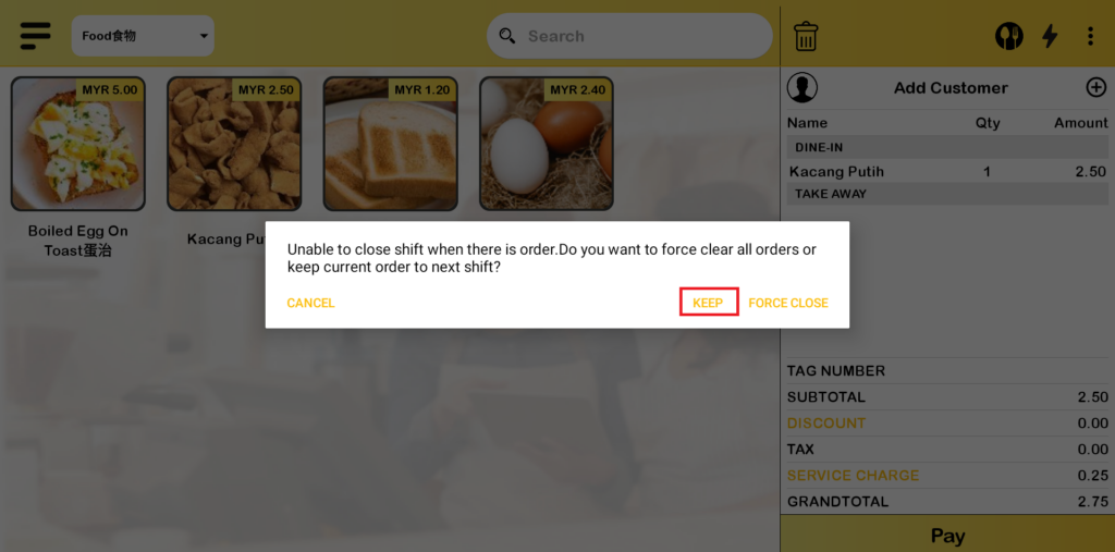 - After click “Close Shift”, the following message will prompt out. There are three options in the message which are “CANCEL”,”KEEP” and “FORCE CLOSE”. Choose “KEEP” to keep the order for the next shift.