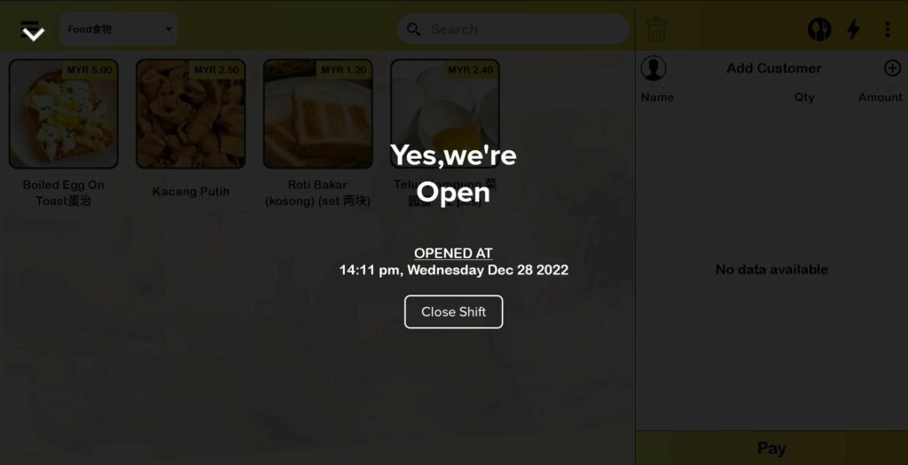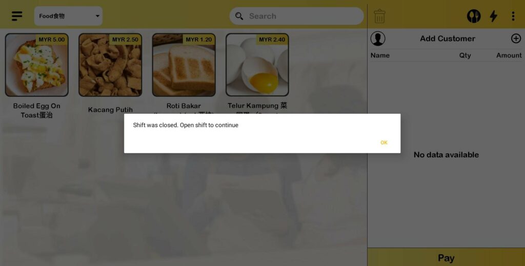 If user performs any actions from a to g, a message will prompt out showing that user must open shift in order to make an order.
