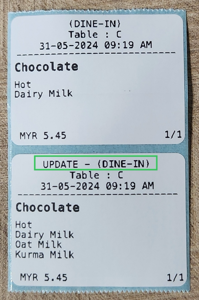 When updating an order variant, a new label will be printed with the word ‘UPDATE’ added beside the serve type to indicate the change.