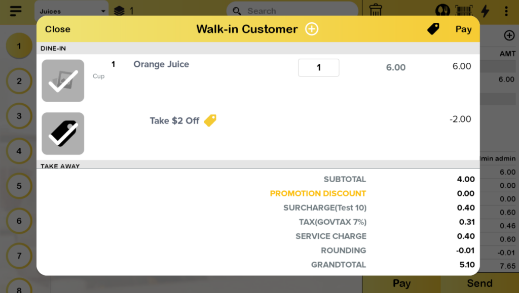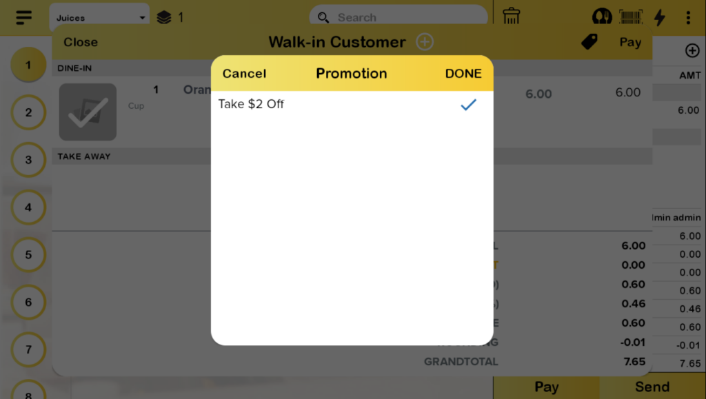 2. The list of item promotions will be displayed. Click on the promotion and press Done. The promotion “Take $2 Off” will be applied.