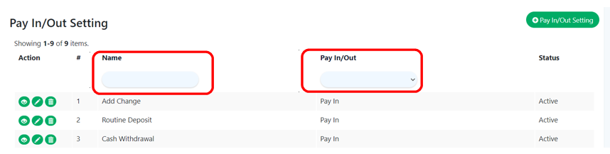 To search a pay in/out setting, there are two choices available for filter usage which are pay in/out reason name and pay in/out reason type.