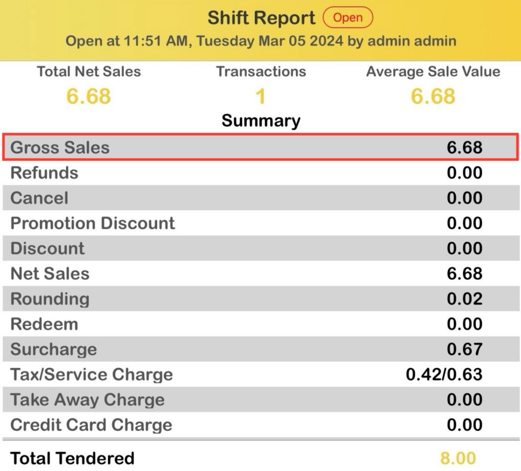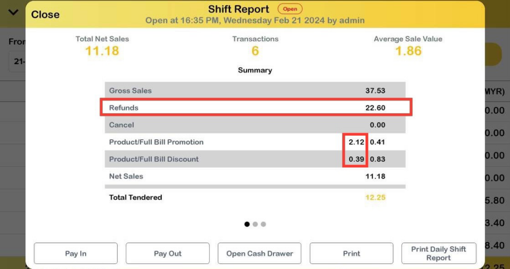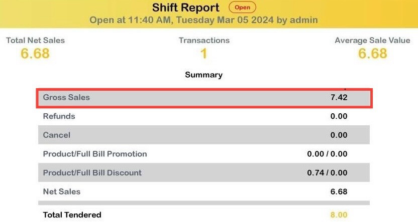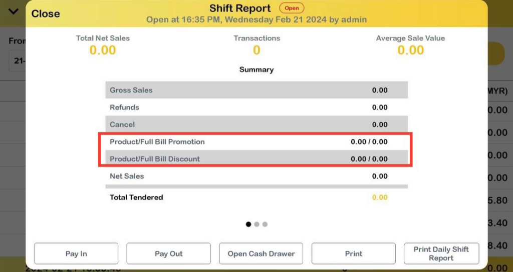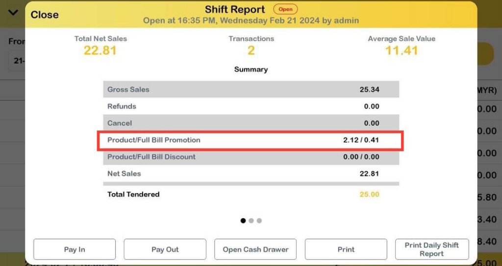 Note: For full bill promotion and full bill discount , it will deduct the value in shift report.