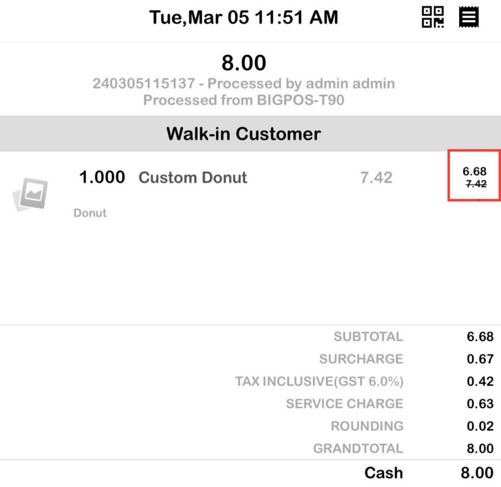 Below is an example of transactions using 10% discount. Product Discount value will shown together in the row followed by Full Bill Discount.