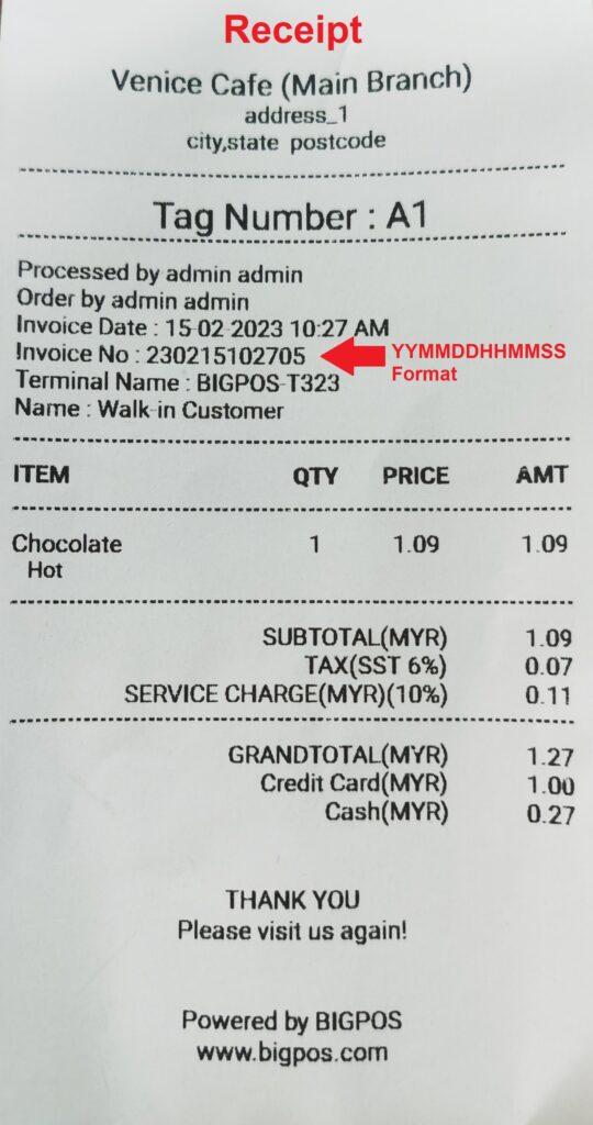 This enhancement enables BIG POS receipt, order sheet, and order summary of invoice numbers to track with date and time easily in a different business mode such as assigning table numbers, auto-generate queue numbers, and assigning tag numbers.