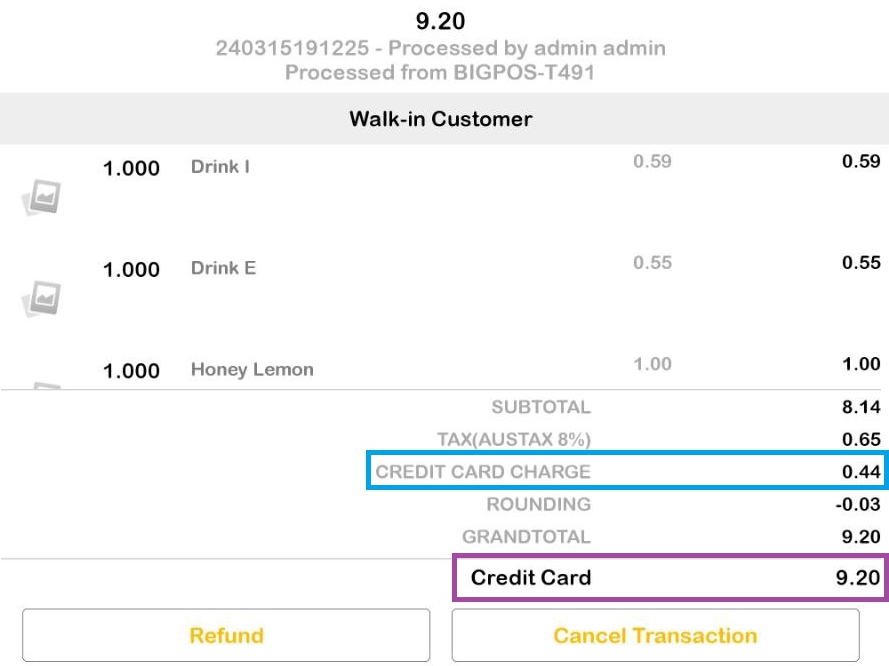 Below is an example of how the credit card charge row displayed when processing a refund. A credit card fee will be included in the refund amount either refund by cash or card.