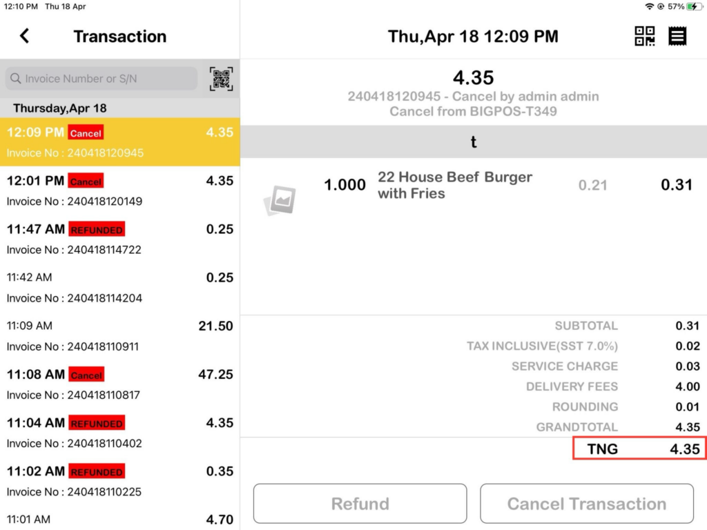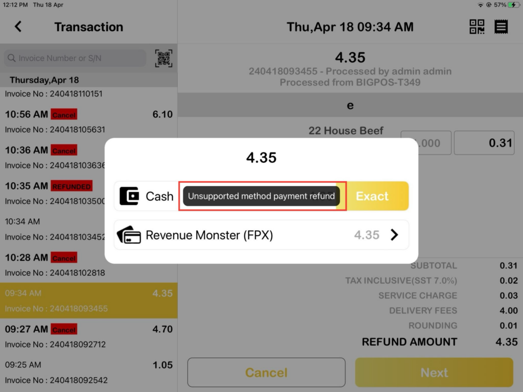 Option of Revenue Monster (FPX) or Revenue Monster (Cards) for refund / cancellation still displays if the customer pays using other than e-wallet method but the refund/cancel transaction cannot be made because it can only be done by cash. Below is an example for Refund/Cancel with FPX .