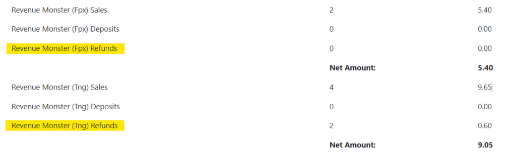 | Shift Report | Revenue Monster | Revenue Monster (*Ewallet) Example : Revenue Monster (TNG) Revenue Monster (FPX) |