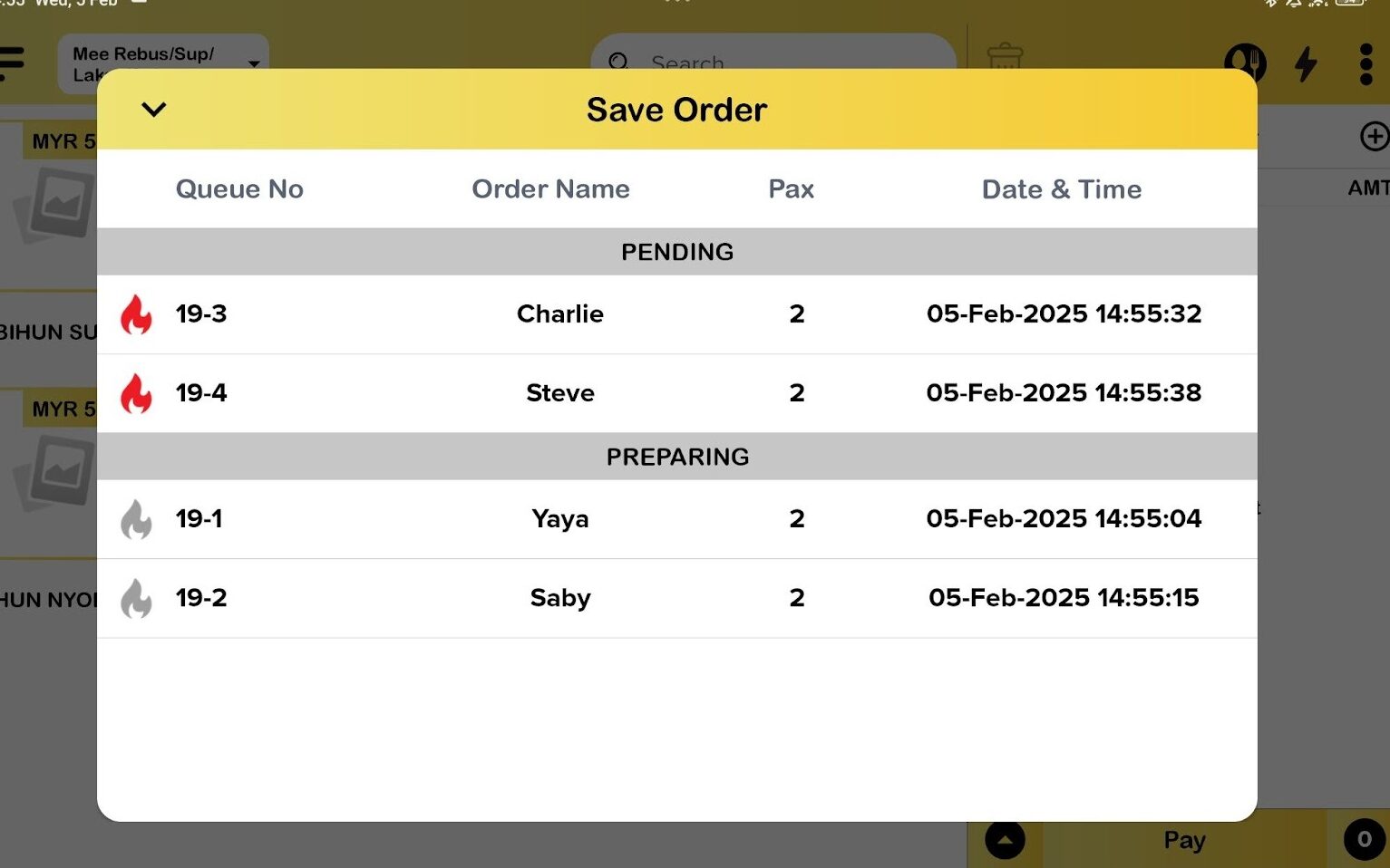 - Any updates on the order in the PREPARING section will move back the order to the PENDING section and need to reclick on fire again to send the order to the kitchen.