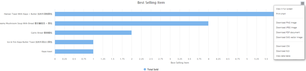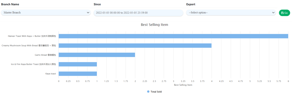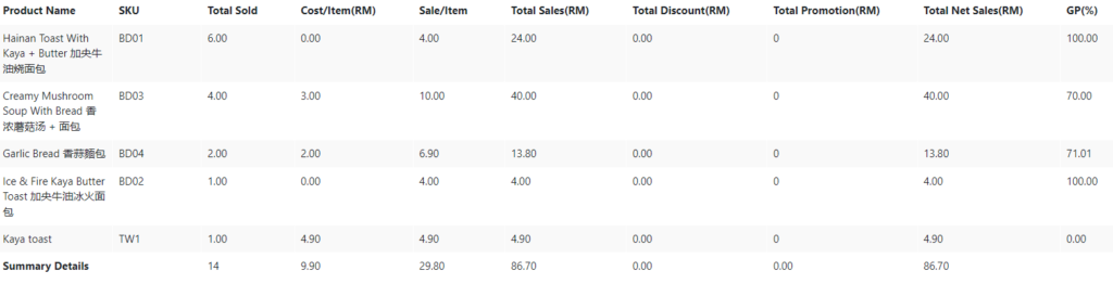 Selling Fast Page provides the overview of best selling products focusing on total sold quantity. Transactions details include the listing of products Name, SKU, Total Sold, Cost/Item, Total Sales, Total Discount, Total Promotion, Total Net Sales, GP percentage and Summary Details. The page will show the 10 best selling items in a chart according to the date range set to view.