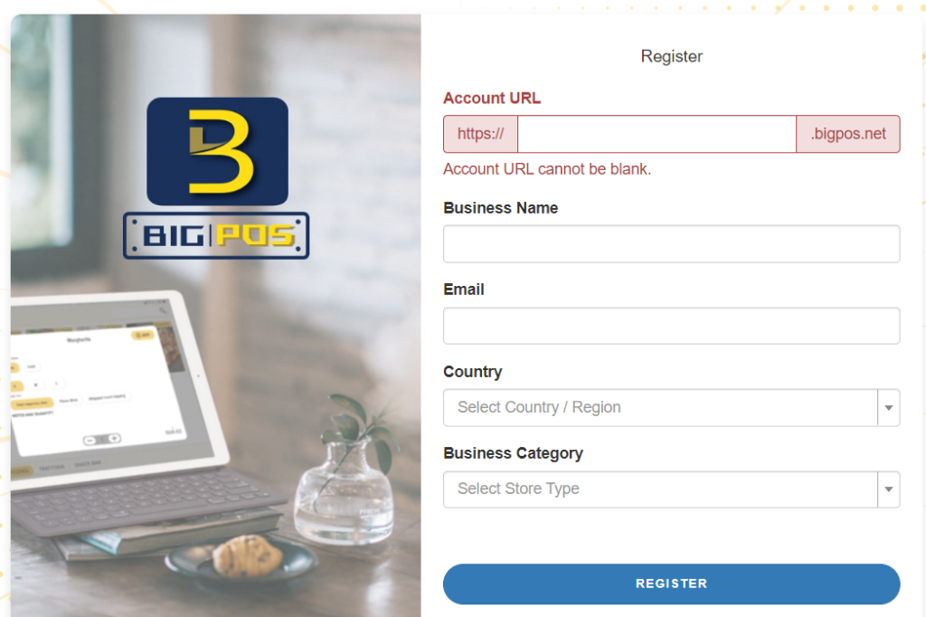 - First, open your browser and type https://secure.bigpos.net/site/signup to enter the BIG POS Register page.
