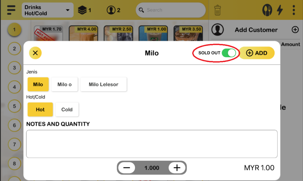 1. To enable the sold-out function in the QR menu only, the user can toggle on the “SOLD OUT” option in BIGPOS Pro. For example, let’s toggle on “SOLD OUT” for Milo.
