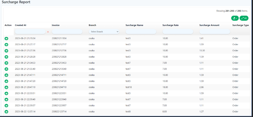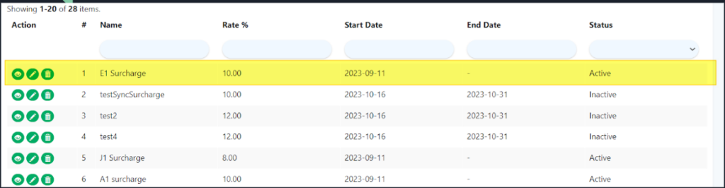 - All created surcharges will be shown under this Surcharge list page.