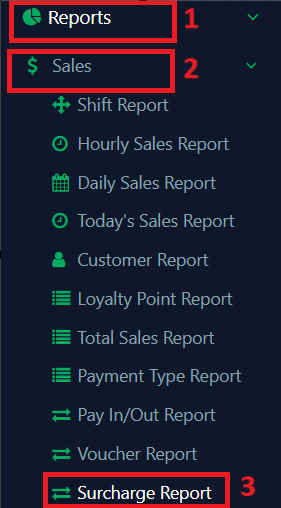 - The location of surcharge report can be access from ‘Reports‘, click ‘Sales‘ and select ‘Surcharge Report‘.