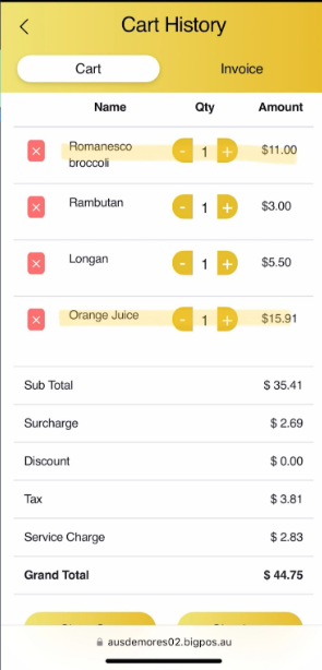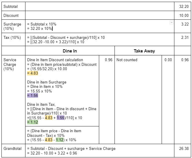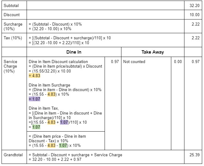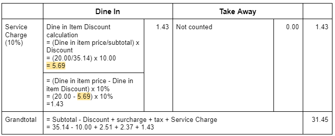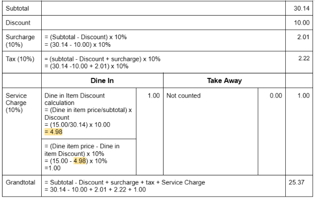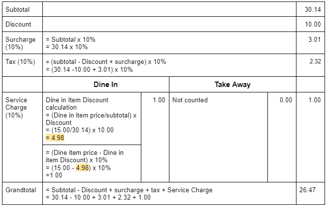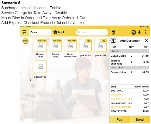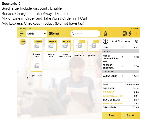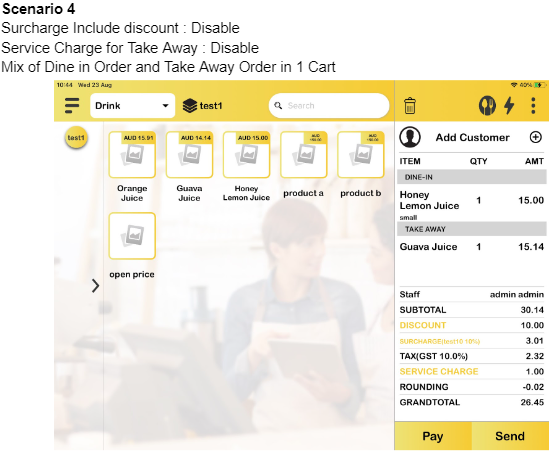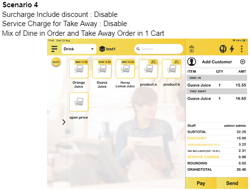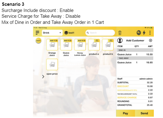 b) Surcharge include discount: Enable, Service Charge for Take Away: Disable, Mix of Dine In order and Take Away Order in 1 Cart