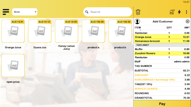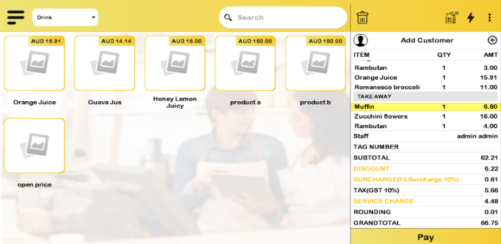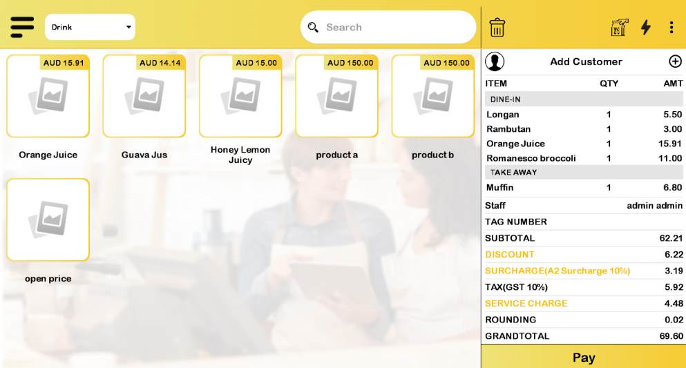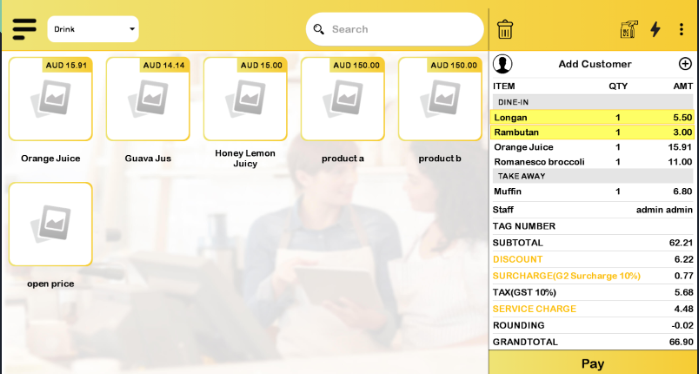 j) Surcharge applies to ‘Product with Tag’ with the order mode applied for ‘Dine in’