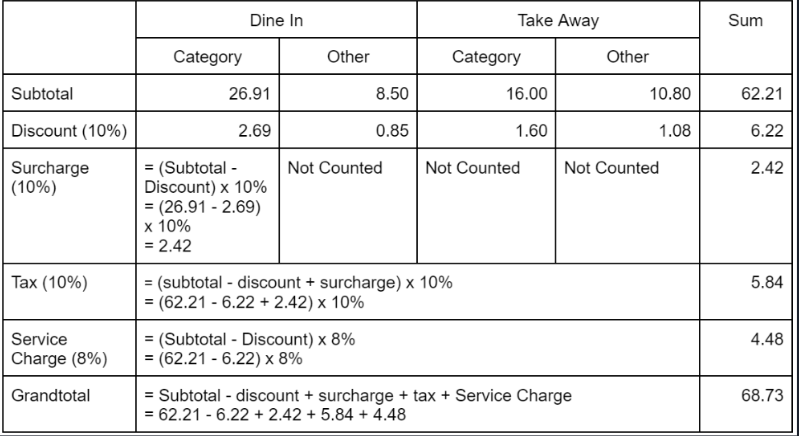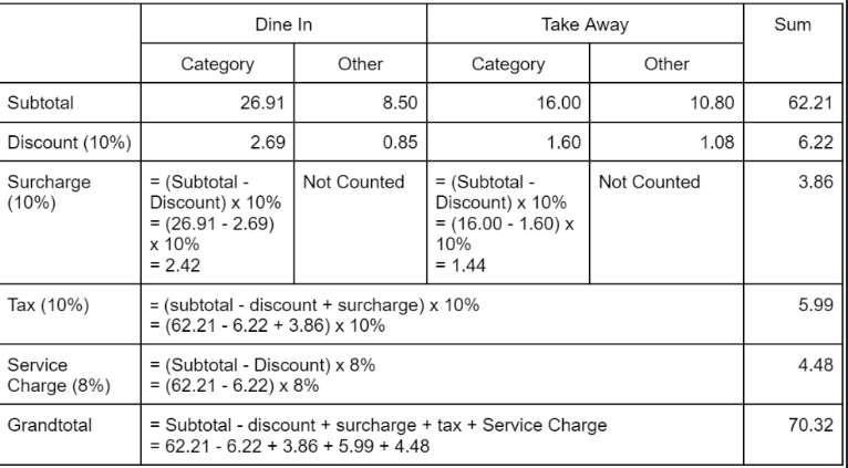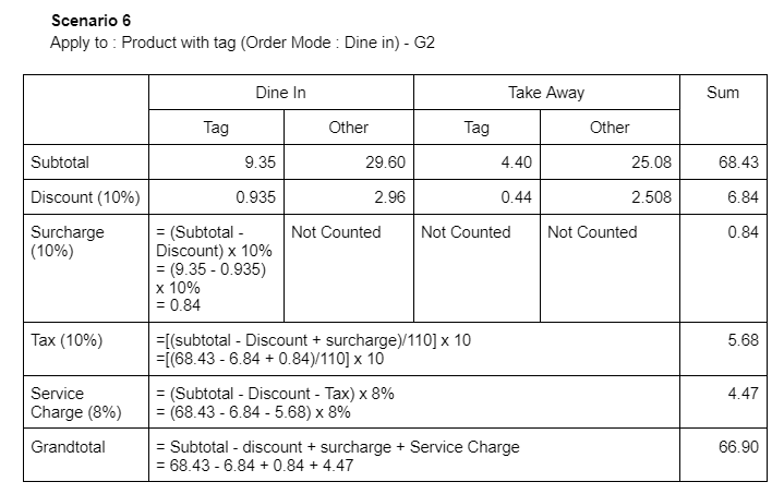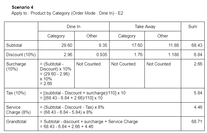 h) Surcharge applies to ‘Category’ with the order mode applied for ‘Dine In’