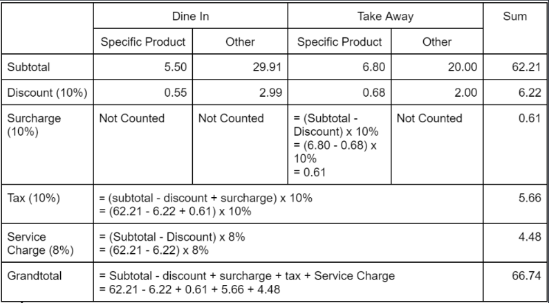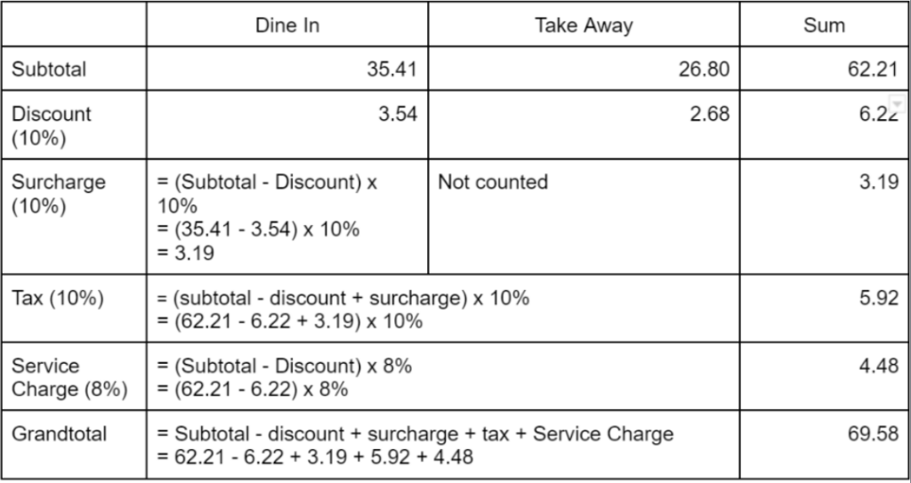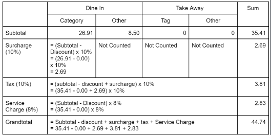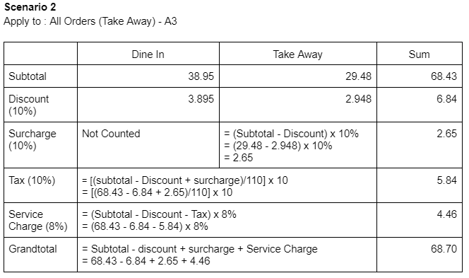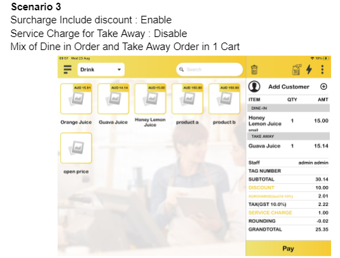 c) Surcharge include discount: Disable, Service Charge for Take Away: Disable, Mix of Dine In Order and Take Away Order in 1 Cart