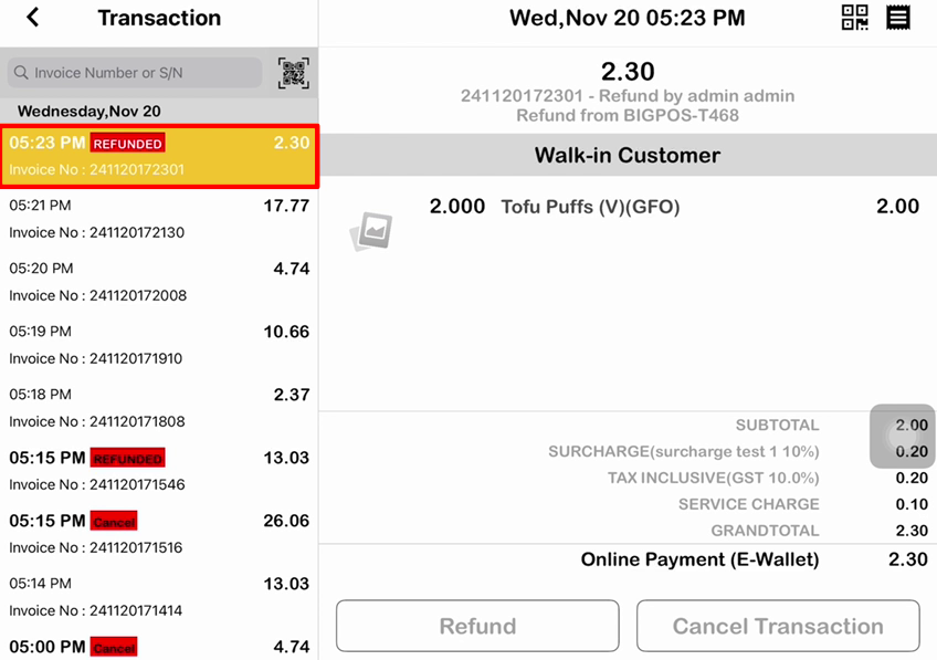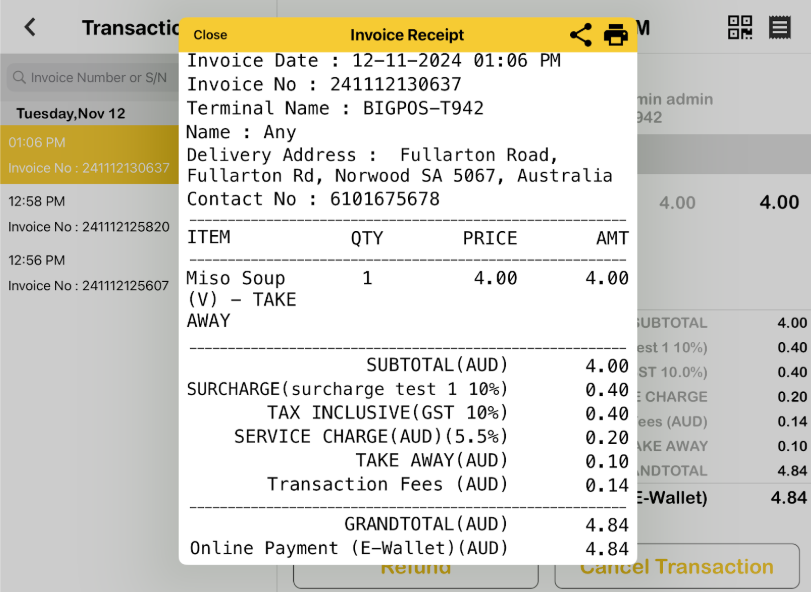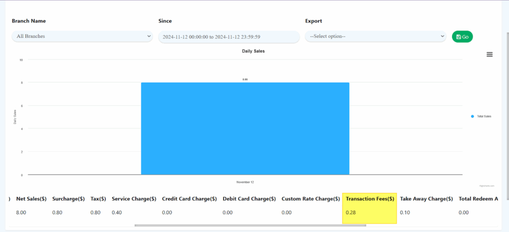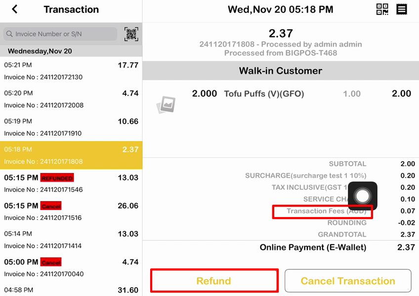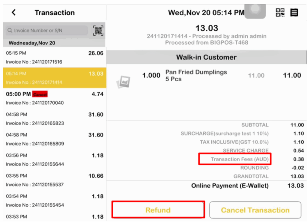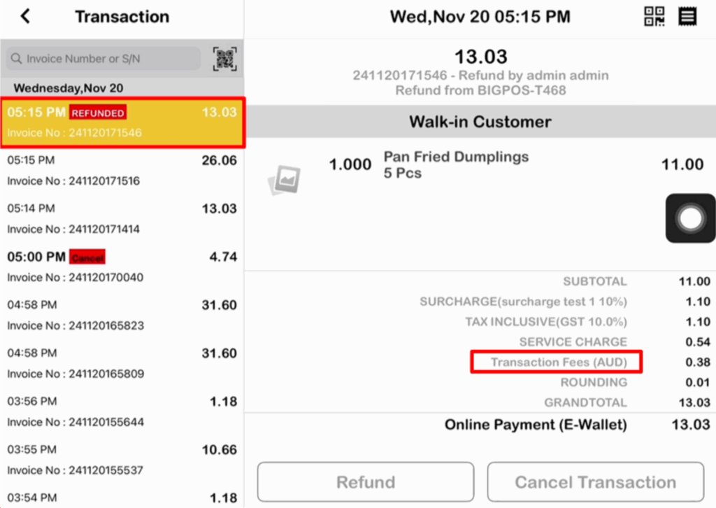 For this method payment there is an additional charge known as “Transaction Fees” on the receipt.