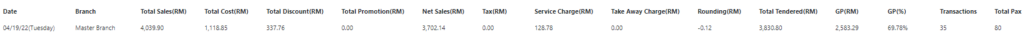 Total Sales Report provides you with total sales details including total sales, total cost, total discount, total promotion, net sales, tax, service charge, take away charge, rounding total tendered, GP (Gross Profit),GP percentage, number of transactions and total pax. This page also shows you the summary of total sales, including total net sales, total GP percentage, total tax and total transactions and provides you with the total sales chart for the date range you filtered.