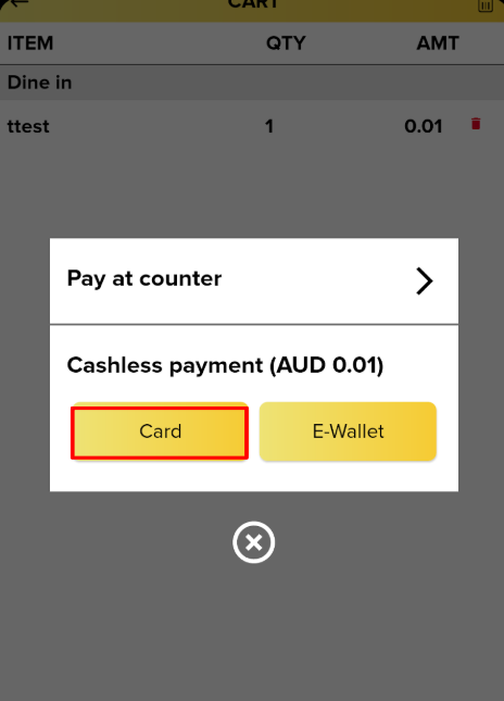 4. Then select Card, wait for Tyro terminal to pop up the payment amount and tap the card on Tyro terminal.