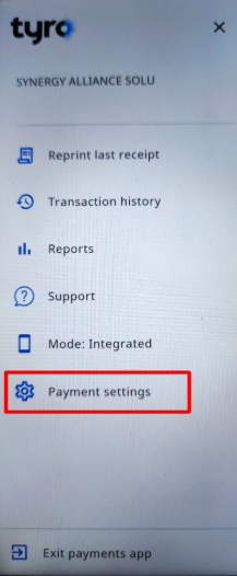 1. In Tyro terminal, go to side menu and click Payment settings.