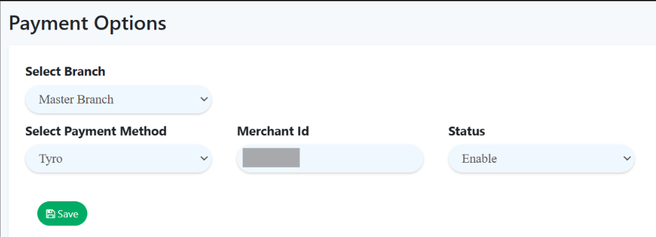 - Ensure that you choose “Tyro” as the Select Payment Method and enter valid Merchant ID. Make sure status is enabled and click the “Save” button.