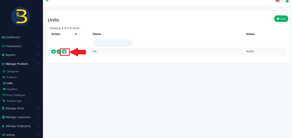 7. To delete an existing unit, you need to click on the dustbin icon to delete.