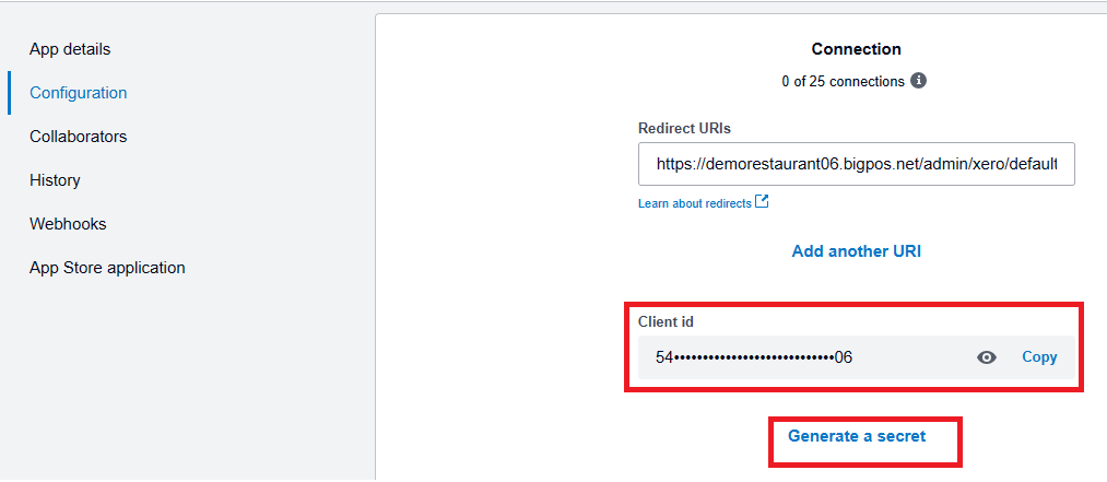 7. “Company or application URL” and “Redirect URI” can be found on BIG POS website “+ Xero Configuration“.