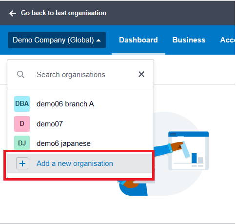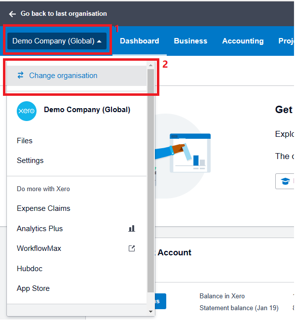12. Select on “Demo Company (Global)” scroll down list and choose “Change organisation“.